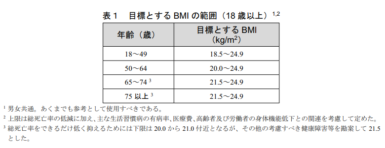これは総死亡率、疾患別の発症率とBMIとの関連、日本人のBMIの実態を踏まえて設定された目標値です。