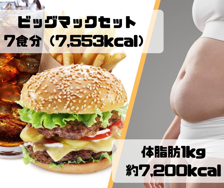 個人差もあるのであくまで概算ですが、およそ7200kcalと言われています。ビッグマックセット7食分くらいですね。